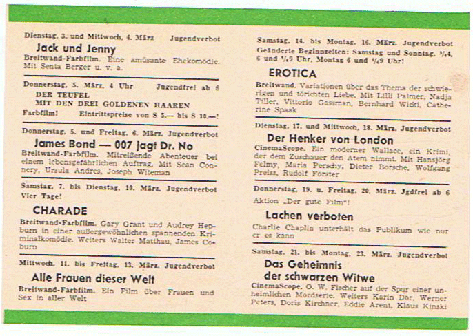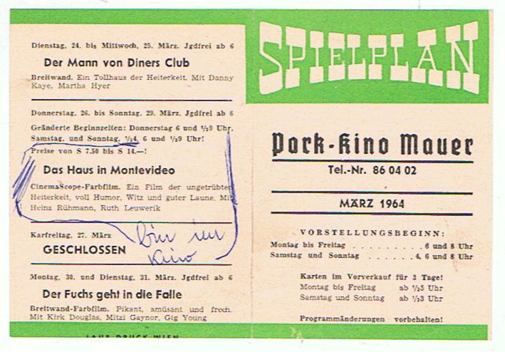 Einen schönen Fund machte ein Wiener Historiker, als er in einer Kennedy-Biografie als "Lesezeichen" ein Programm des Kinos aus dem Jahr 1964 fand, dazu eine Kinokarte - und den handschriftlichen Verweis "bin im Kino". Wir bedanken uns für die Information und das Material. Quellen M.Abt. 104, Feuer- und Sicherheitspolizei, A 8–17: Hietzinger Arena www.hietzing.at |